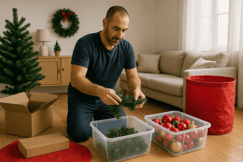 Καθαρά, στεγνά, ταξινομημένα. Κουτιά με διαχωριστικά, σακουλάκια silica για υγρασία, μικρές ετικέτες (σαλόνι/παιδικό). Το τεχνητό δέντρο σκουπίζεται με βουρτσάκι και μπαίνει σε θήκη — λέμε «όχι» σε σακούλες που σκίζουν και ρίχνουν σκόνη.